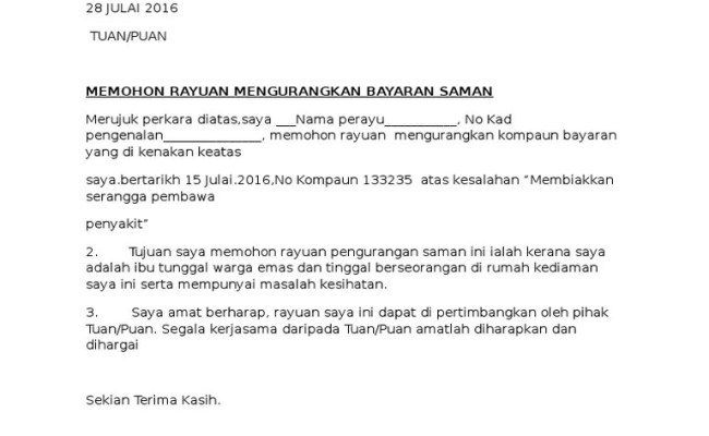 Contoh Surat Rayuan Pengurangan Bayaran / Contoh Surat Rayuan Pengurangan Kompaun Ssm